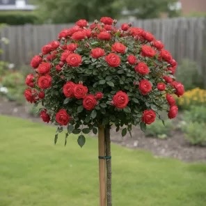 Высота/диаметр растения (10 лет): 1-1,1 м Время цветения: весь сезон, до заморозков Морозостойкость: -25 Местоположение: солнце Оригинальность: эффектная расцветка Отличительная черта: длительное цветение Особенность: густомахровый сорт Роза штамбовая «Феникс» (флорибунда)