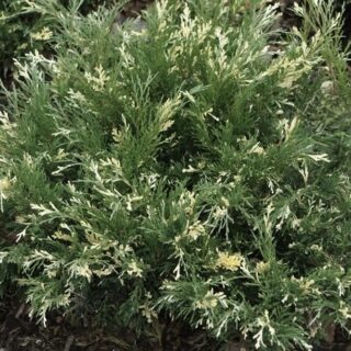 Компактный подушковидный хвойный кустарник с радиально растущими ветвями. Высота 50 см, диаметр кроны до 2 м. Крона низкая, подушковидная, плотная. В 10 лет высота 30-40 см, диаметр 60-70 см. Годовой прирост 10 см. Красивая форма с лучисто расположенными побегами. Хвоя короткая, чешуйчатая, тонкая, плотно прижата к побегам, серо-зелёная, на концах оригинальные кремово-белые пятнышки. К зиме приобретает фиолетовый оттенок.