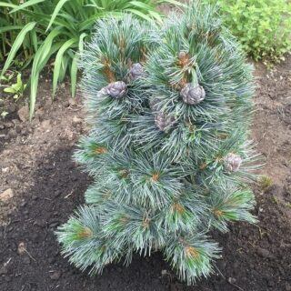 Нетребовательное хвойное дерево. К 10-ти годам высота 2,5-3 м, диаметр 1,5 м. В молодом возрасте растёт медленно, позже скорость роста увеличивается. Форма в молодом возрасте колонновидная, плотная, затем широко-коническая. Хвоя имеет сине-зелёно-серебристый окрас, 8 см длиной, собрана в пучки по 5 хвоинок. Шишки прямостоячие, яйцевидные, 5-8 см длиной, зеленовато-фиолетовые.